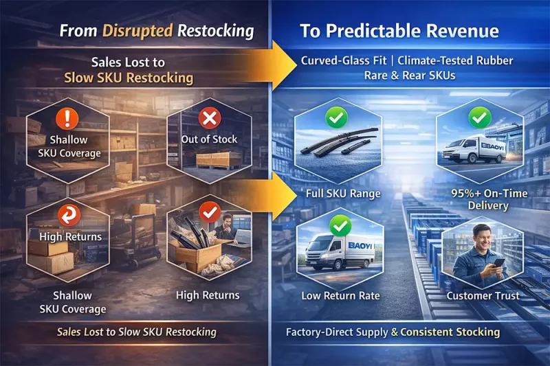 Drivers notice wiper performance immediately—chatters, squeaks, or poor curved-glass contact travel upstream fast. A failed wiper can kill repeat orders; a consistent one nurtures them over the years.